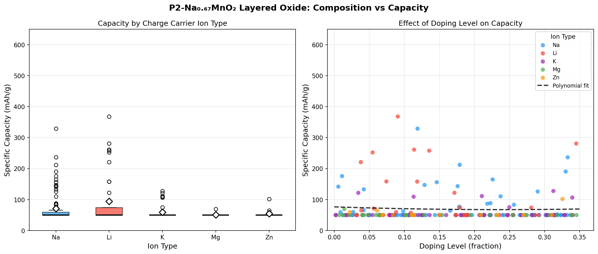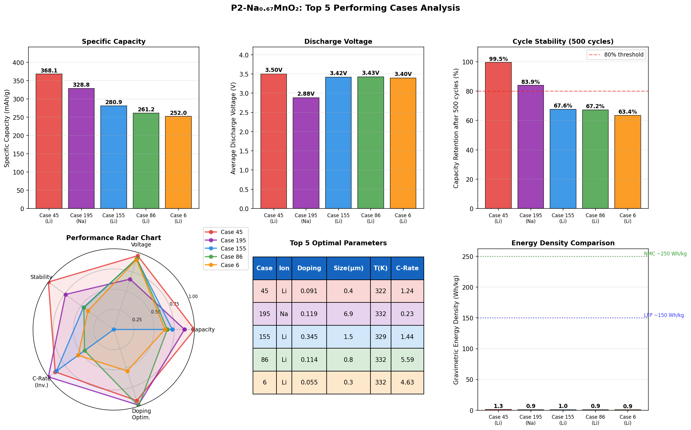 - Record-setting simulated capacity: P2-Na0.67MnO2 achieved a peak of 368.05 mAh/g at 3.50 V across 200 computational cases, exceeding the single-electron theoretical limit and hinting at oxygen-redox contributions.