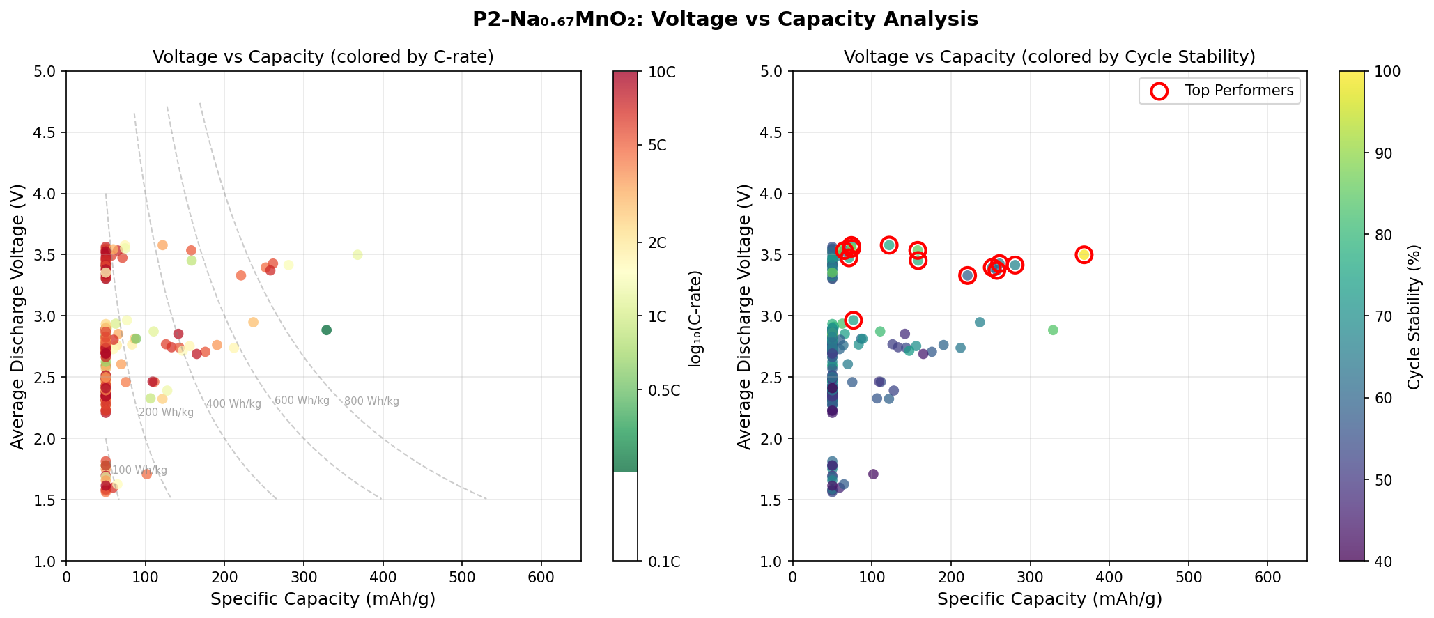 The most striking pattern in the top-five results is how concentrated high performance is near 3.4β3.5 V. Four of the five best cases cluster in this narrow band, with the outlier at 2.88 V. This suggests that the dominant redox couple β almost certainly the Mn3+/Mn4+ transition β delivers its highest capacity when the cell is cycled in the upper voltage window, likely because more sodium can be extracted at higher potentials before structural instability kicks in.
