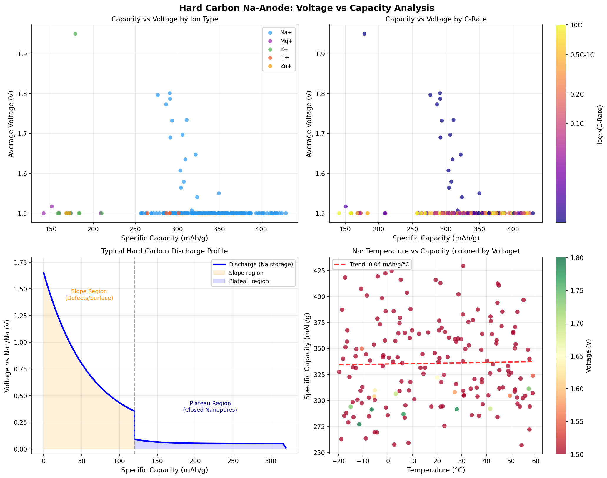 Synthesis is another bottleneck. Hard carbon's performance depends sensitively on pyrolysis temperature, precursor chemistry, and post-treatment. Different precursors (sucrose, cellulose, pitch, biomass) produce hard carbons with different pore architectures and defect densities, and reproducing the specific structures that achieve >400 mAh/g at industrial scale is non-trivial. There's also a fundamental tension: the high-temperature processing (typically 1000–1600°C) needed to optimize the structure is energy-intensive, partially offsetting the sustainability advantages of the cheap precursors. And the rate capability — how quickly the material can charge and discharge — is generally inferior to graphite, because the sodium plateau region near 0 V is kinetically sluggish.