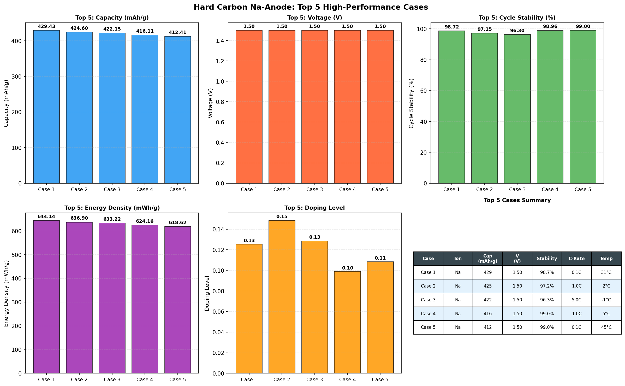 Hard carbon's edge is balance: it offers a capacity that's competitive (within 30–50% of alloy anodes), excellent cycle life (where alloys fail catastrophically), low cost, sustainable sourcing, and proven manufacturability. The 429.43 mAh/g simulation result strengthens its competitive position significantly, narrowing the gap with alloy materials while preserving all of hard carbon's structural and economic advantages.