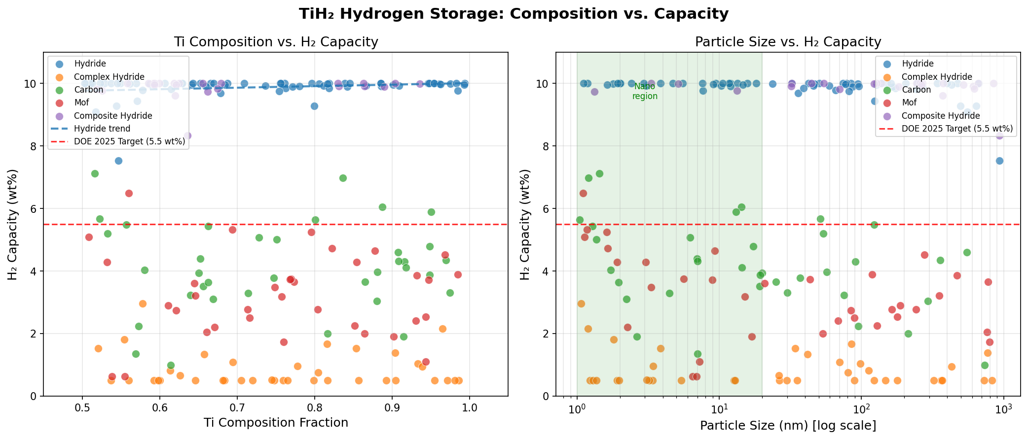 - TiH₂ vs. MgH₂ (Magnesium Hydride): MgH₂ holds about 7.6 wt% hydrogen with a desorption temperature near 300 °C. TiH₂'s 10.00 wt% is substantially higher in capacity, but MgH₂ traditionally releases hydrogen at lower temperatures — though the 198.50 °C scenario in our TiH₂ dataset actually beats MgH₂. Magnesium is also lighter and cheaper, giving MgH₂ a long-standing edge in cost-per-kilogram-stored.