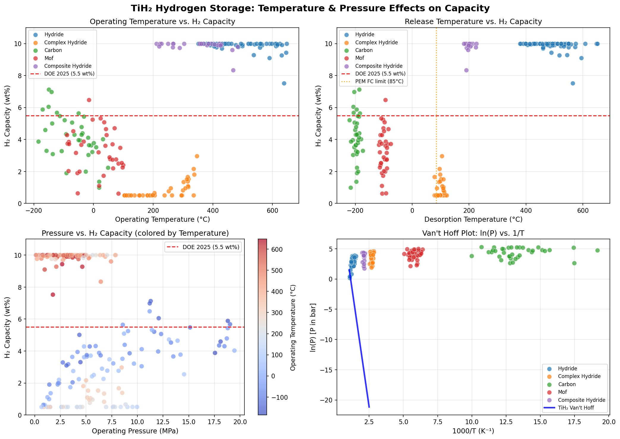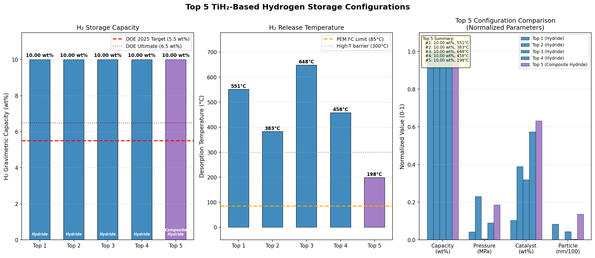 - Best-Case Low-Temperature Release — 198.50 °C: The fifth-ranked scenario showed full capacity release at under 200 °C, a far more practical figure that hints at how nanostructuring or doping could realistically push TiH₂ toward viability.