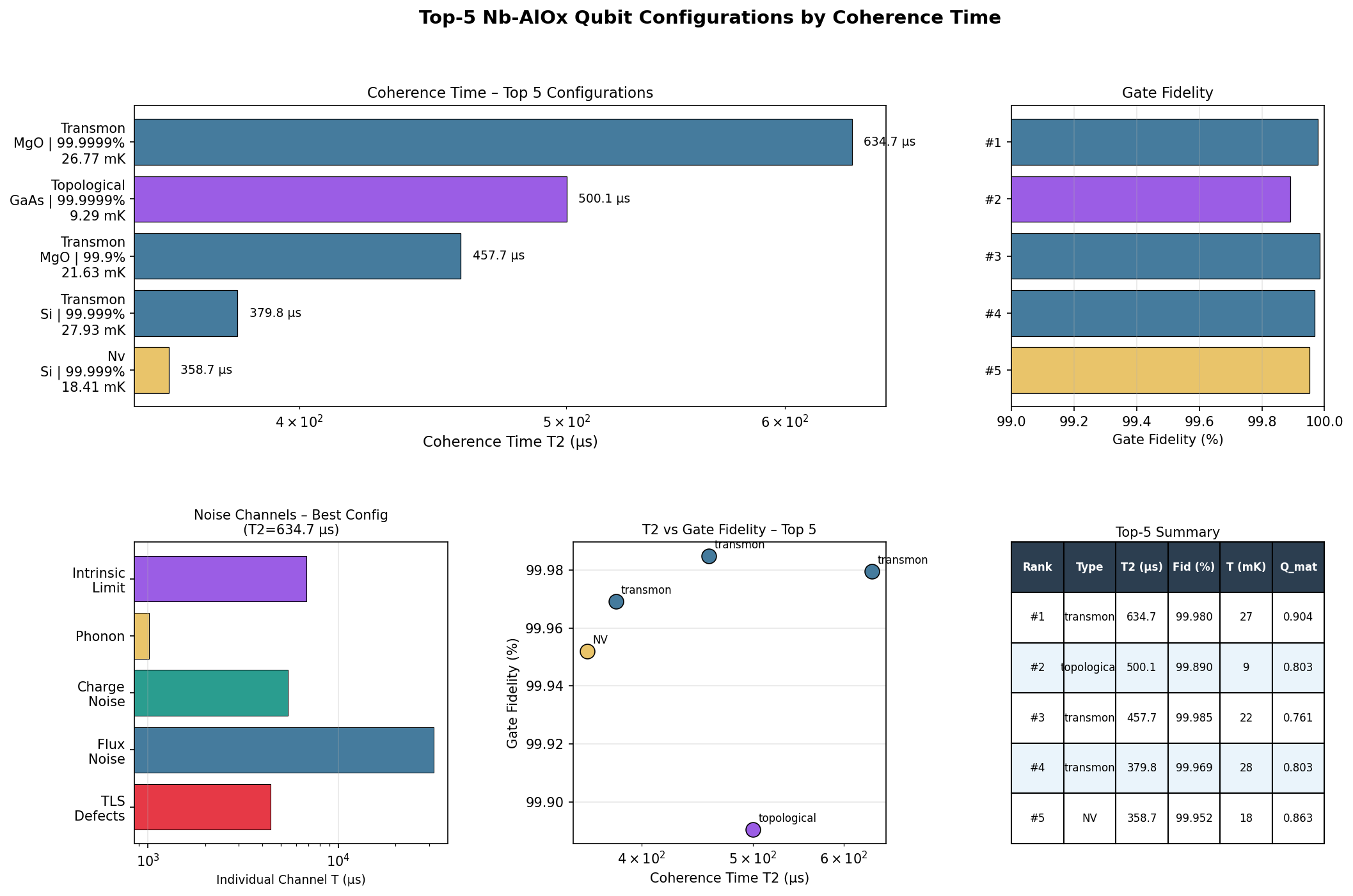 Looking at the top five results, an interesting pattern emerges. The second-best coherence time of 500.11 μs came with a gate fidelity of 99.89% — still excellent, but slightly lower. Meanwhile, the third-ranked configuration flipped the script: a coherence time of 457.71 μs paired with a gate fidelity that matched the top score at 99.98%. The fourth and fifth entries (379.82 μs at 99.97% and 358.67 μs at 99.95%, respectively) continued this trend of consistently high fidelity even as coherence times varied.