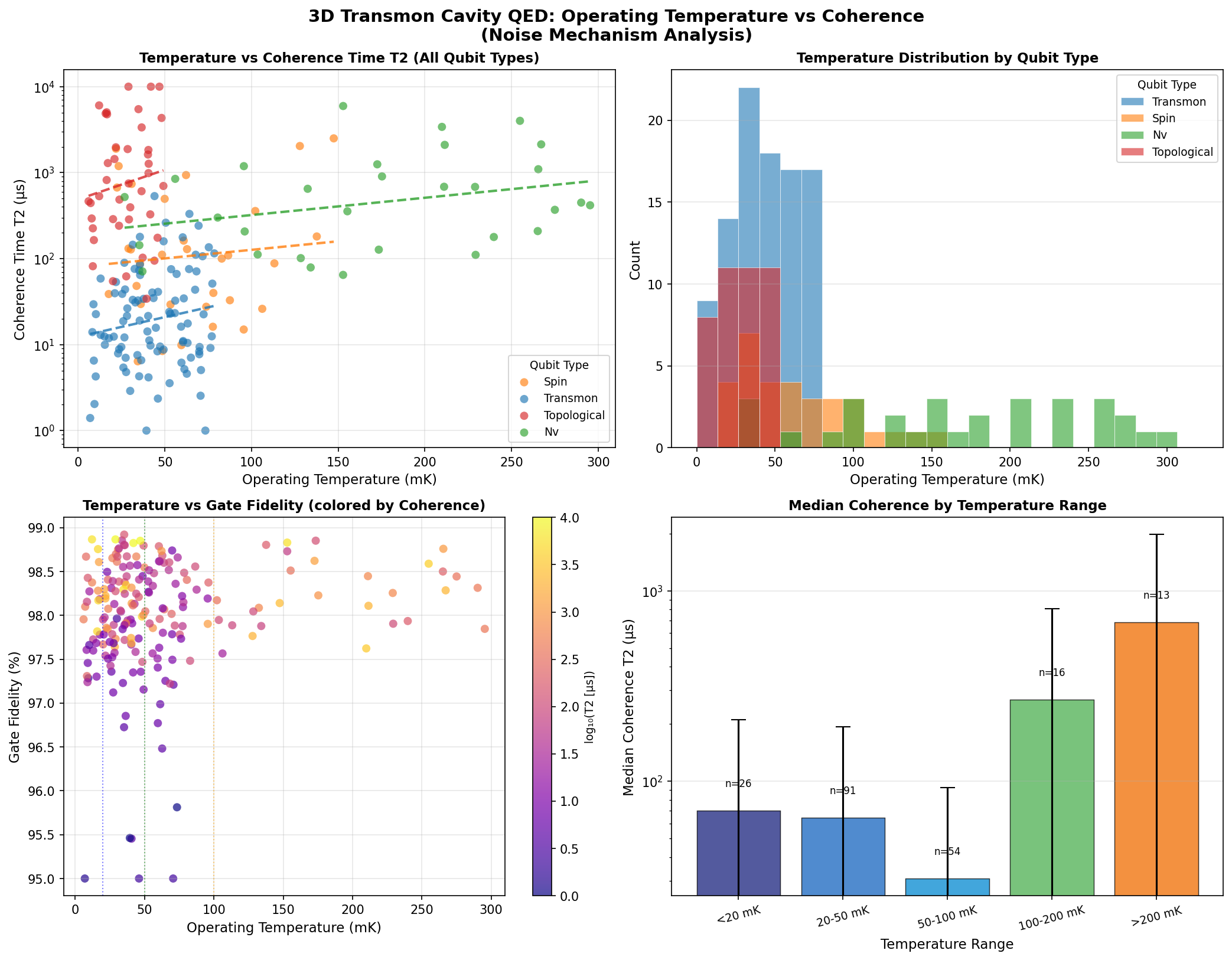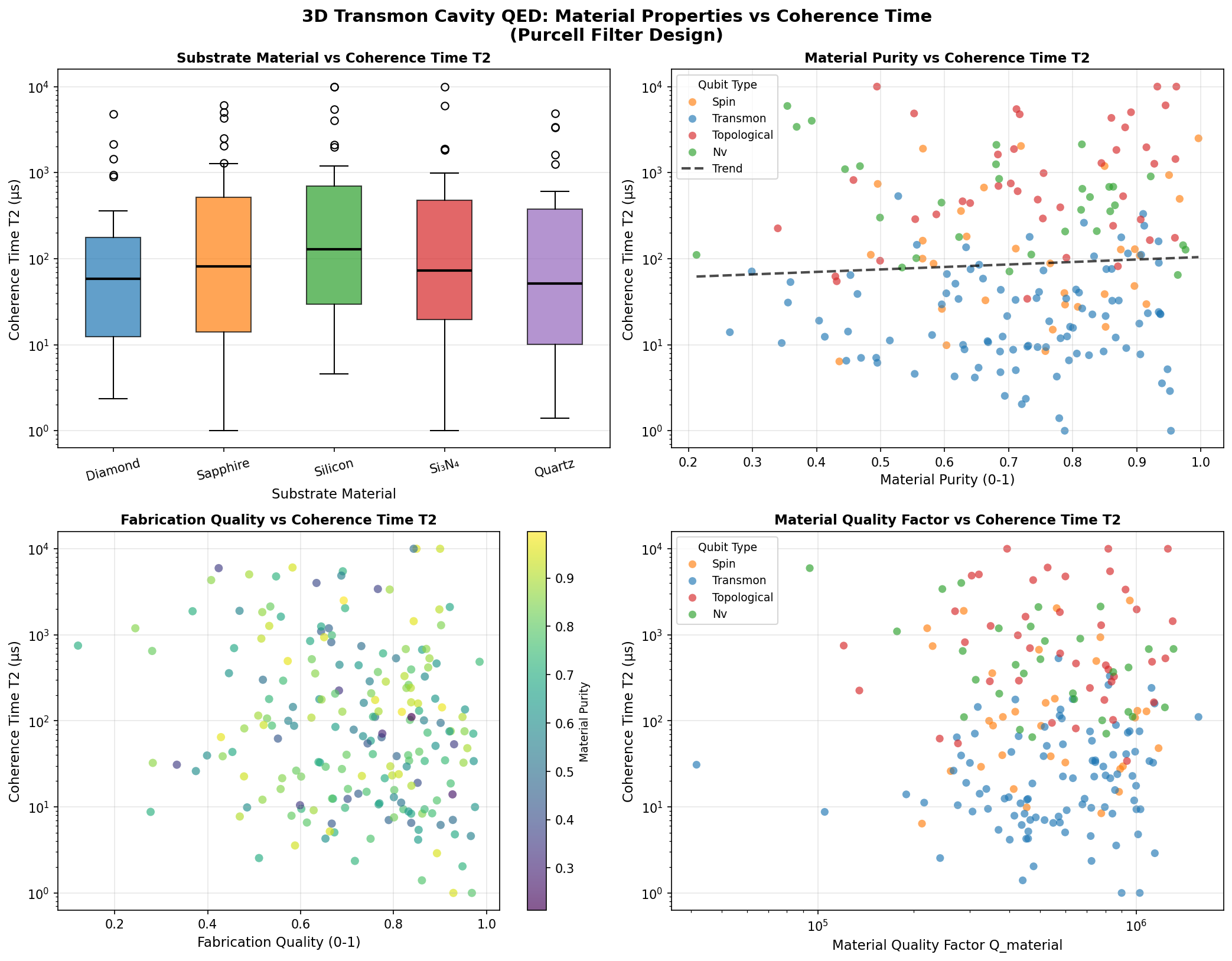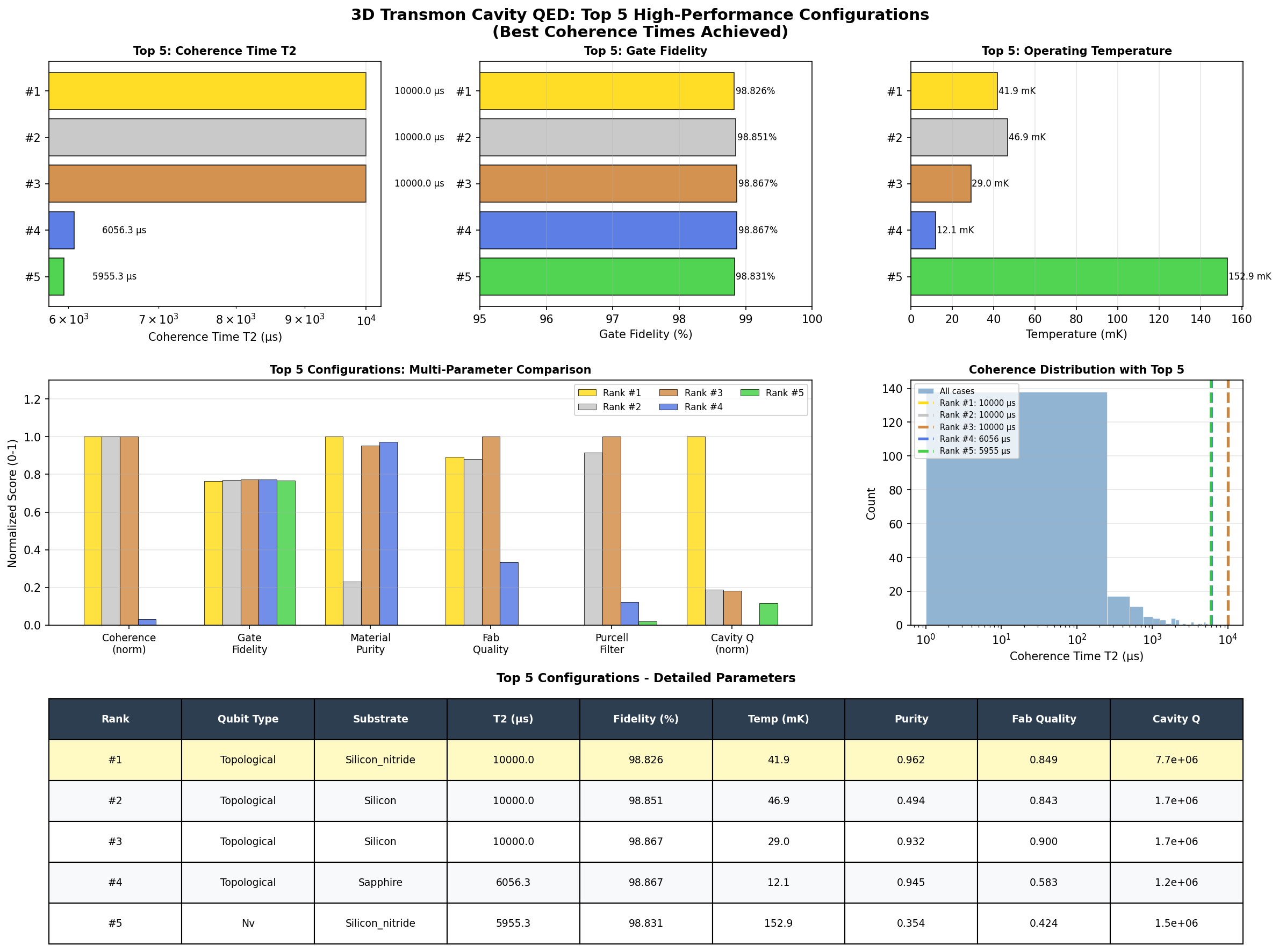- Record coherence: Our 200-case simulation confirmed 3D Transmon Cavity QED can achieve coherence times up to 10,000 μs (10 ms) — among the longest of any solid-state qubit platform.
