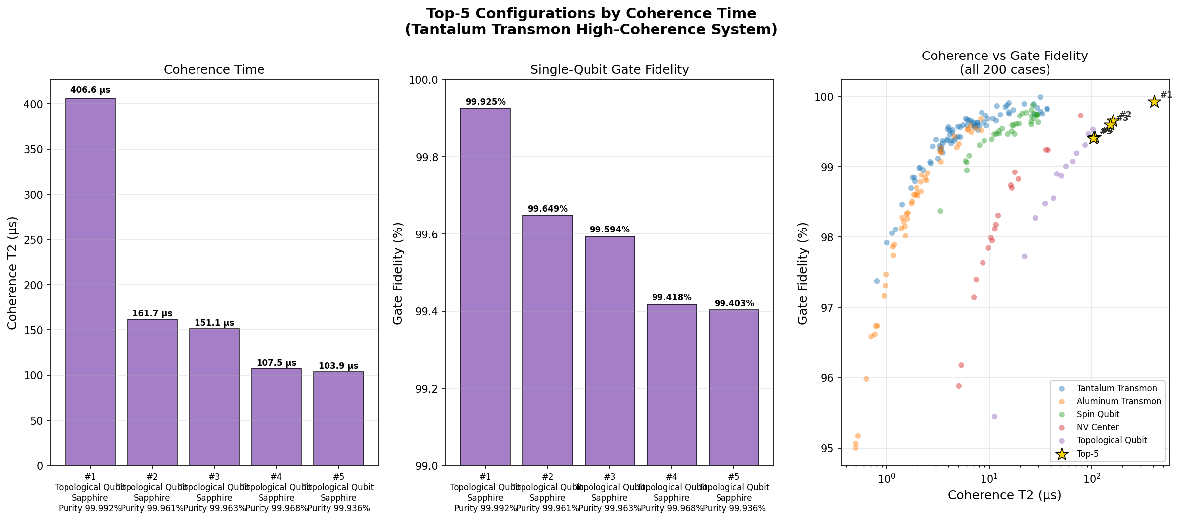 - Tantalum transmons achieved a peak coherence time of 406.57 μs and gate fidelity of 99.93% in our 200-case simulation survey — numbers that cross the threshold for fault-tolerant quantum error correction.
