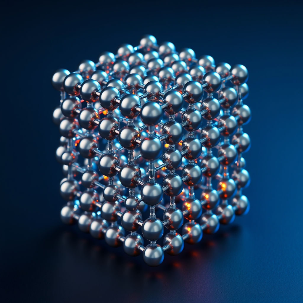 Photorealistic 3D scientific visualization of tantalum metal crystal structure as a superconducting transmon qubit material, showing body-centered cubic (BCC) tantalum atomic lattice with precise metallic gray-silver spherical atoms connected by crystallographic bonds, ultra-clean surface with minimal oxide layer defects highlighted in subtle blue-green contrast, quantum coherence represented by ethereal standing wave interference patterns surrounding the lattice in cool electric blue and violet hues, cross-sectional view revealing bulk crystalline order transitioning to atomically smooth surface termination, two-level system defect sites shown as rare glowing amber anomalies sparsely distributed to indicate reduced TLS density compared to aluminum oxide, superconducting Cooper pairs visualized as paired golden particle trails flowing through the lattice, microscale Josephson junction interface rendered in precise detail at the bottom of the structure, ambient studio lighting with soft blue scientific atmosphere, depth of field focusing on central atomic arrangement, ultra-high resolution render, materials science textbook quality, dark navy background, physically based rendering with subsurface metallic sheen, 8K detail level