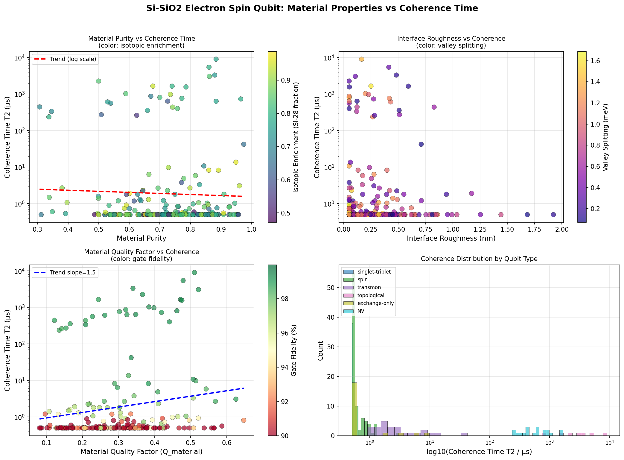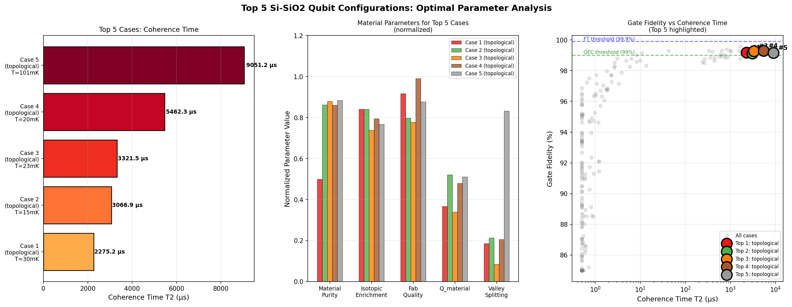 - Outstanding coherence: The best simulated Si-SiO2 device achieved a coherence time of 9051.16 μs — roughly 30× longer than typical superconducting qubits.