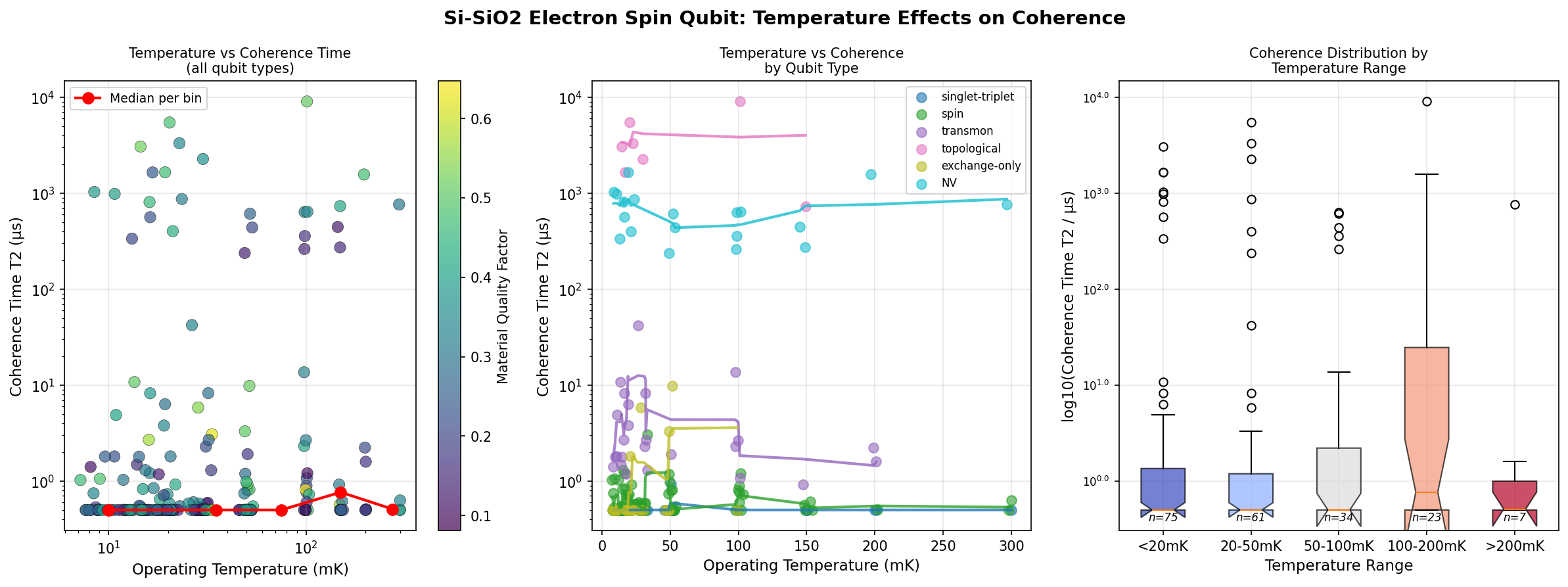 Three findings stand out from the dataset. First, the spread between the best coherence time (9051.16 μs) and the fifth-ranked (2275.21 μs) is roughly a factor of four. This wide variability tells us that device-level details — interface roughness, gate geometry, charge defect density — matter enormously. Small changes in fabrication can yield order-of-magnitude differences in performance. That's both a warning and an opportunity: it means achieving the best results consistently will demand fabrication discipline, but it also means there's substantial headroom for improvement.