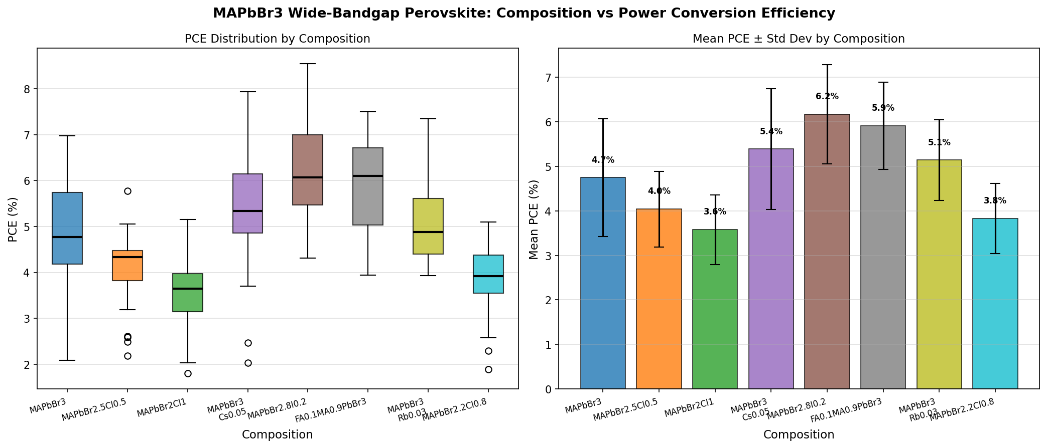 An 8.55% efficiency might sound modest next to the 26%+ figures you see in headlines about MAPbI₃ (methylammonium lead iodide, the iodine-based cousin with a narrower 1.55 eV bandgap). But comparing them directly is a bit like comparing a sports car to a cargo truck — they're built for different jobs.