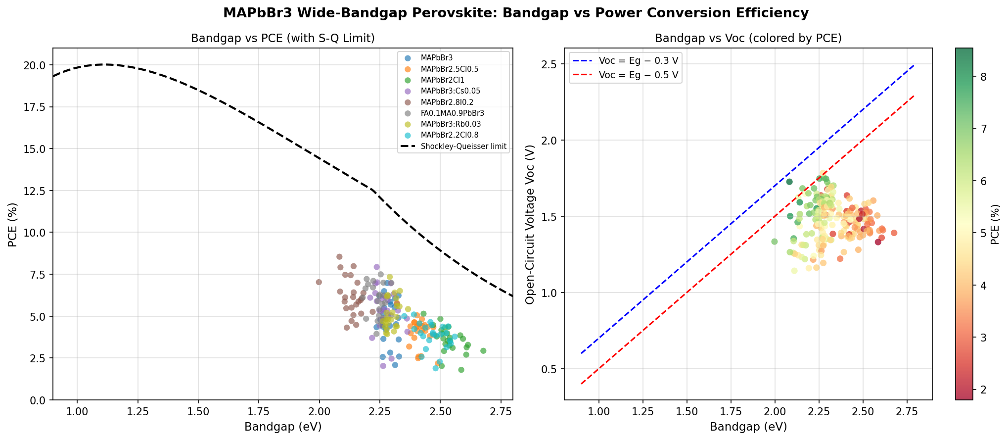 That 8.55% peak occurred at an optimal bandgap of 2.08 electron-volts (eV). A bandgap is the minimum energy a photon needs to kick an electron free and generate current. For context, silicon's bandgap sits around 1.1 eV, and the most efficient perovskites hover near 1.5–1.6 eV. At 2.08 eV, MAPbBr₃ is firmly in wide-bandgap territory — it ignores red and infrared light but thrives on blue and green photons.