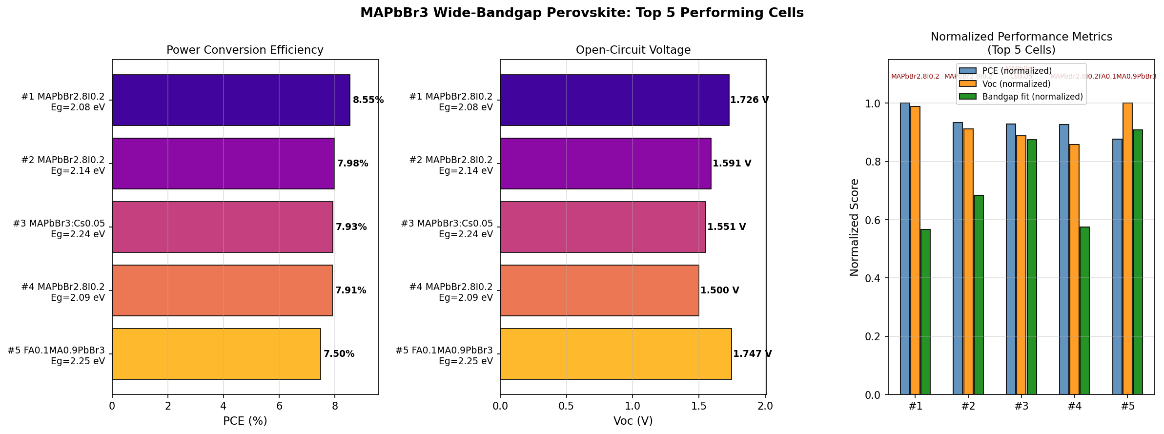 The clustering of high performers tells a story. Four of the top five results fall within a narrow bandgap window of roughly 2.08–2.24 eV, suggesting that MAPbBr₃ has a genuine "sweet spot" rather than a scattered distribution of lucky hits. This is good news for manufacturability: if the optimum were razor-thin, producing reproducible cells at scale would be nearly impossible.