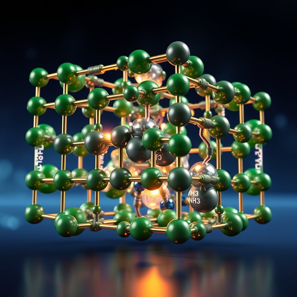 A photorealistic 3D scientific visualization of MAPbBr3 methylammonium lead bromide perovskite crystal structure, showing the characteristic cubic ABX3 perovskite lattice framework, with large green bromine anions occupying corner-bridging positions forming octahedral coordination geometry, central gray lead cations (Pb2+) at the B-site surrounded by six bromine atoms in perfect PbBr6 octahedra, and methylammonium organic cations (CH3NH3+) depicted as molecular stick-and-ball representations with cyan carbon, blue nitrogen, and white hydrogen atoms nestled within the cuboctahedral cavities of the inorganic framework, the overall crystal rendered with semi-transparent crystallographic unit cell boundary lines in gold, dramatic studio lighting casting soft shadows through the translucent ionic structure, deep space-blue background gradient, subtle orange-amber light emission glowing from within the lattice symbolizing the 2.3 eV wide bandgap photon absorption, high-resolution photorealistic rendering, physically based materials with subsurface scattering on ionic spheres, ray-traced reflections, scientific publication quality, 8K detail, cinematic depth of field with sharp foreground crystal and softly blurred repeating unit cells receding into background