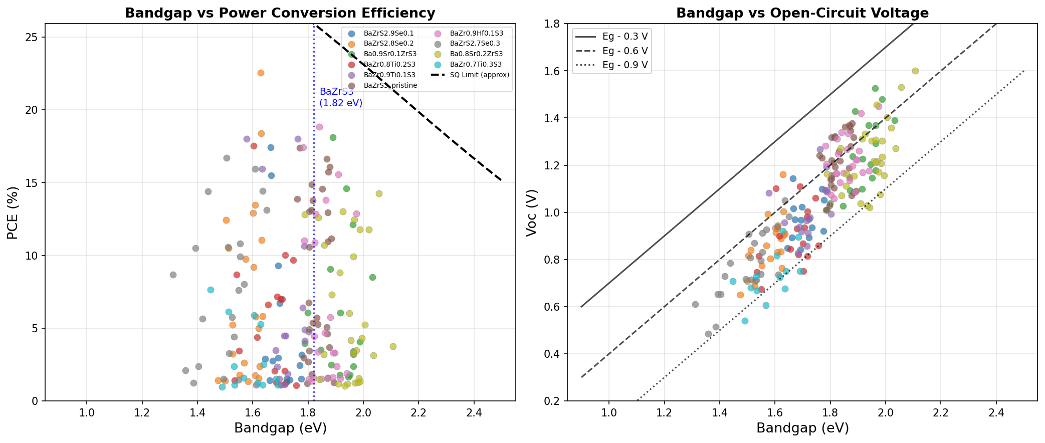 That bandgap matters enormously. A photovoltaic absorber needs a bandgap large enough to generate a useful voltage but small enough to capture a wide swath of the solar spectrum. The theoretical maximum efficiency for a single-junction cell, known as the Shockley-Queisser limit, peaks for bandgaps between roughly 1.1 and 1.5 eV. BaZrS3's natural bandgap sits a touch above this ā around 1.7 to 1.9 eV depending on synthesis conditions ā but our simulations show it can be tuned, through composition or strain engineering, down to the 1.6 eV range where light harvesting is most productive.