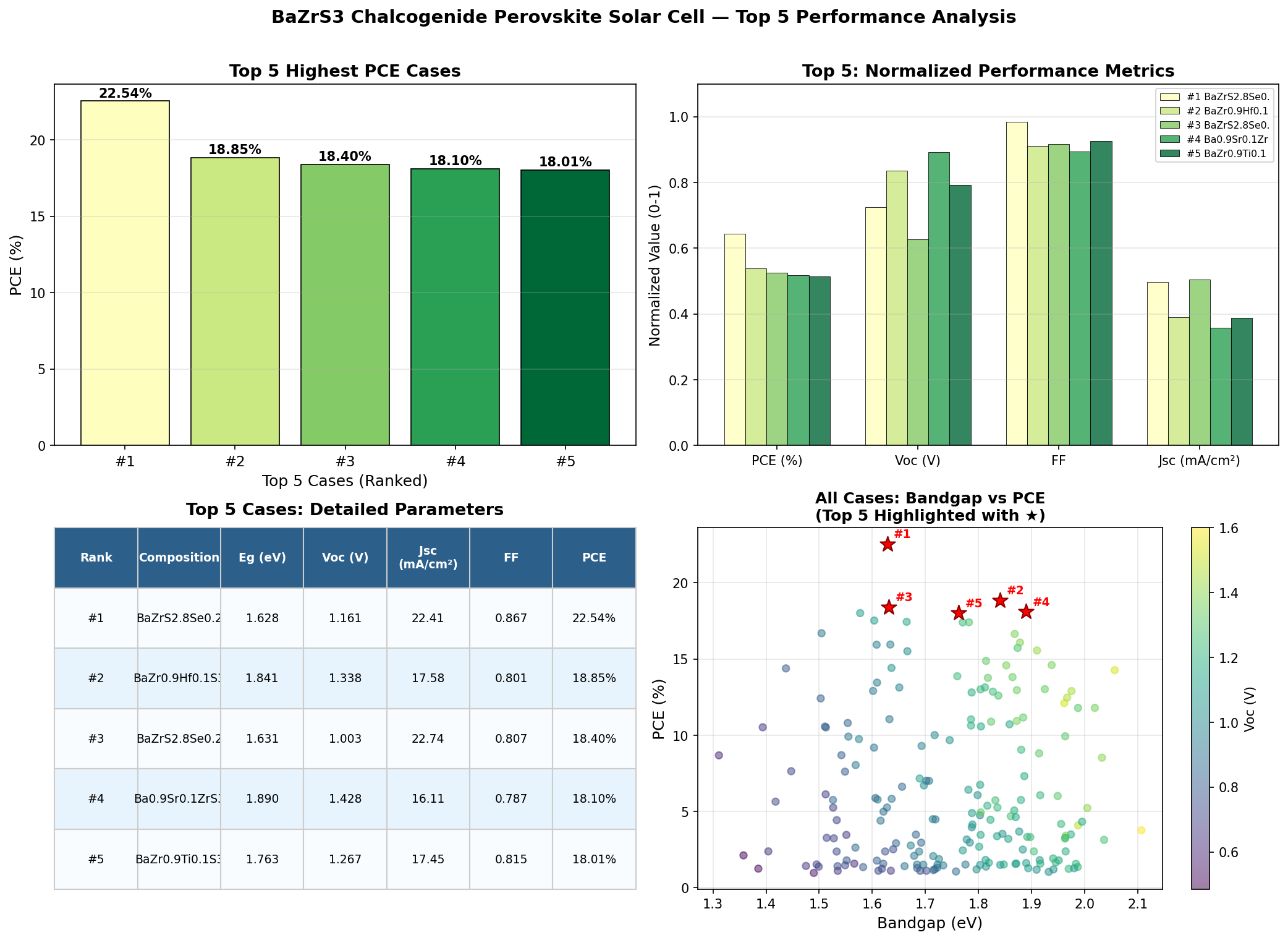 The standout takeaway is the gap between the best case (22.54%) and the next cluster (around 18%). That four-point jump suggests the optimal configuration sits in a relatively narrow design window ā getting the bandgap dialed in near 1.63 eV unlocks performance that the rest of the parameter space simply can't match.