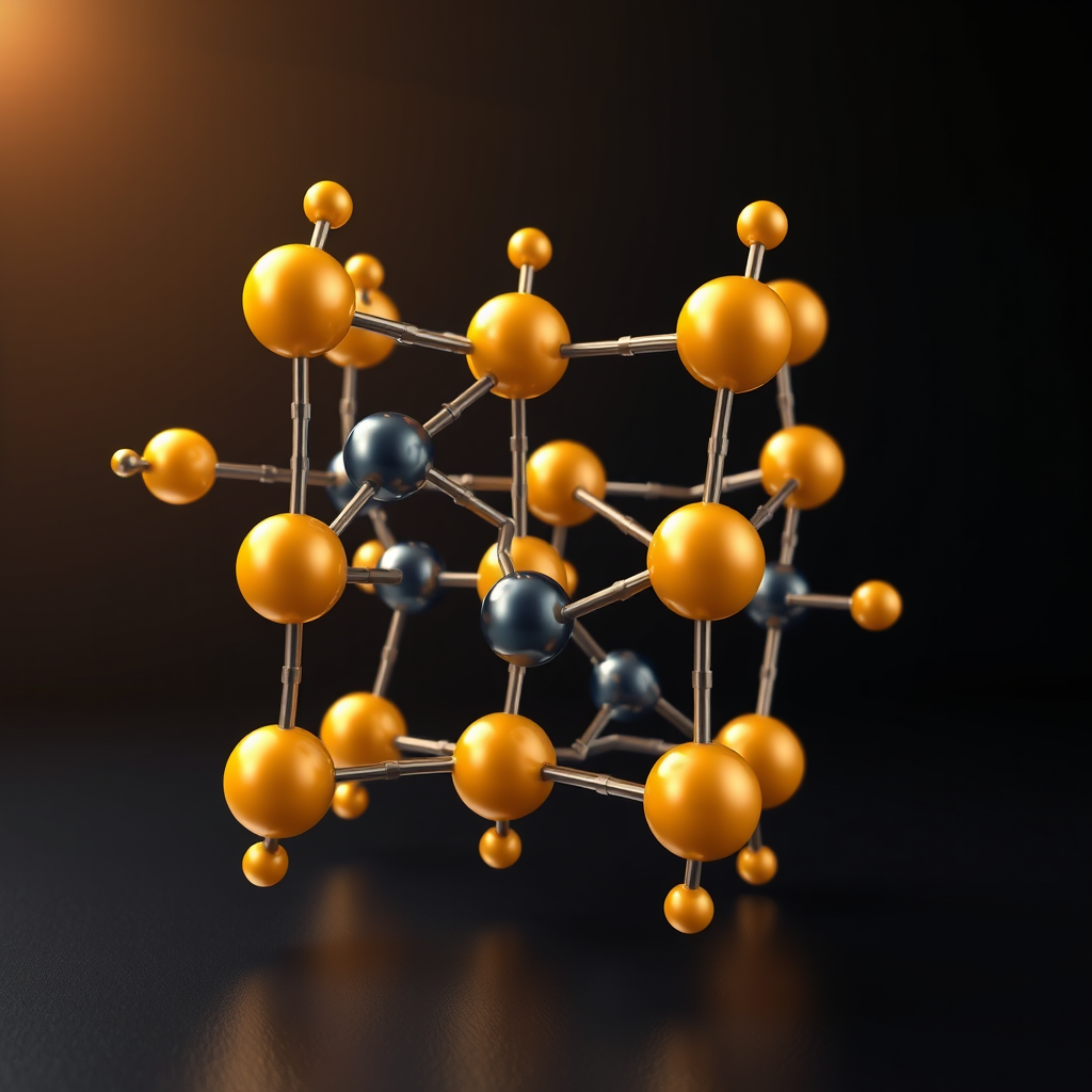 Photorealistic 3D scientific visualization of BaZrS3 chalcogenide perovskite crystal structure, orthorhombic distorted perovskite lattice with GdFeO3-type distortion, showing large barium atoms rendered as vibrant gold-yellow spheres at cuboctahedral A-site positions, medium zirconium atoms rendered as deep blue-gray metallic spheres at B-site octahedral centers, sulfur atoms rendered as bright amber-orange spheres forming tilted ZrS6 corner-sharing octahedra, accurate Pnma space group symmetry with clearly visible octahedral tilting, multiple unit cells extending in all three dimensions to reveal the full periodic network, dramatic studio lighting with subtle subsurface scattering on atom spheres, dark navy gradient background suggesting a high-tech laboratory environment, thin semi-transparent chemical bonds rendered as cylindrical connectors, soft ambient occlusion shading for depth, floating annotation labels identifying Ba Zr and S atoms with elegant sans-serif typography, photovoltaic solar energy context suggested by a warm golden directional light simulating sunlight striking the crystal surface, ultra-high detail 8K render, scientific illustration style combining beauty and accuracy, shallow depth of field focusing on the central unit cell cluster, professional materials science journal quality visualization