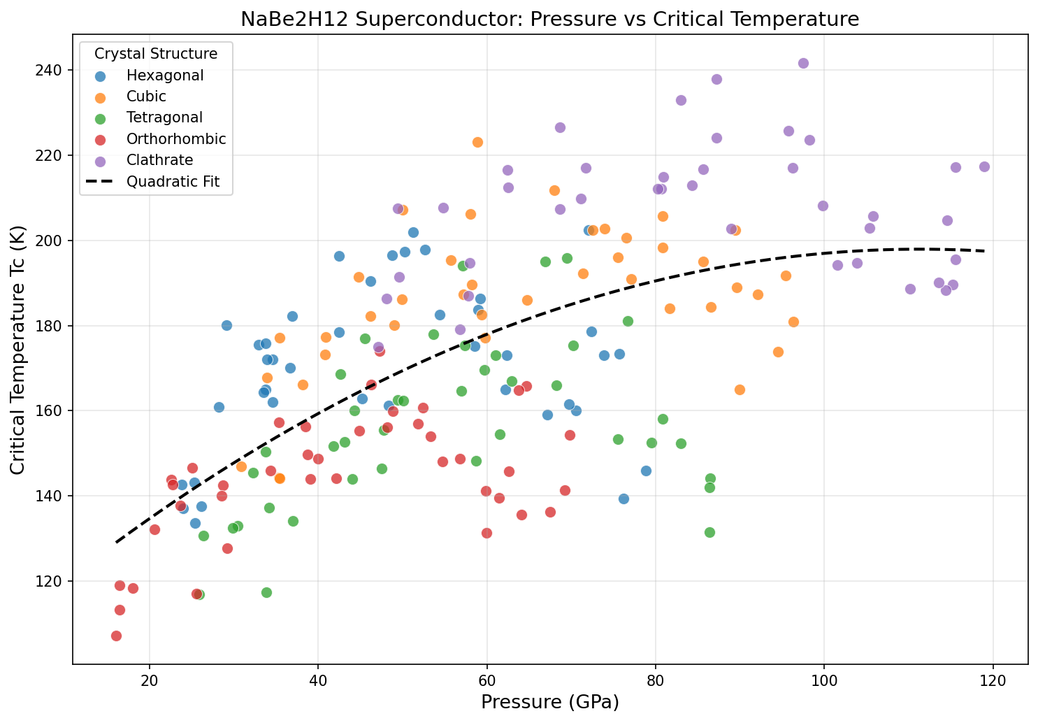 Against this backdrop, NaBe₂H₁₂ is notable for two reasons. Its predicted Tc of 241.6 K is competitive with the best-known hydrides, and crucially, it achieves that performance at significantly lower pressure — under 100 GPa versus the 150–200 GPa typical for lanthanum or sulfur hydrides. Lower pressure means easier synthesis, larger potential sample volumes, and faster progress toward practical applications.