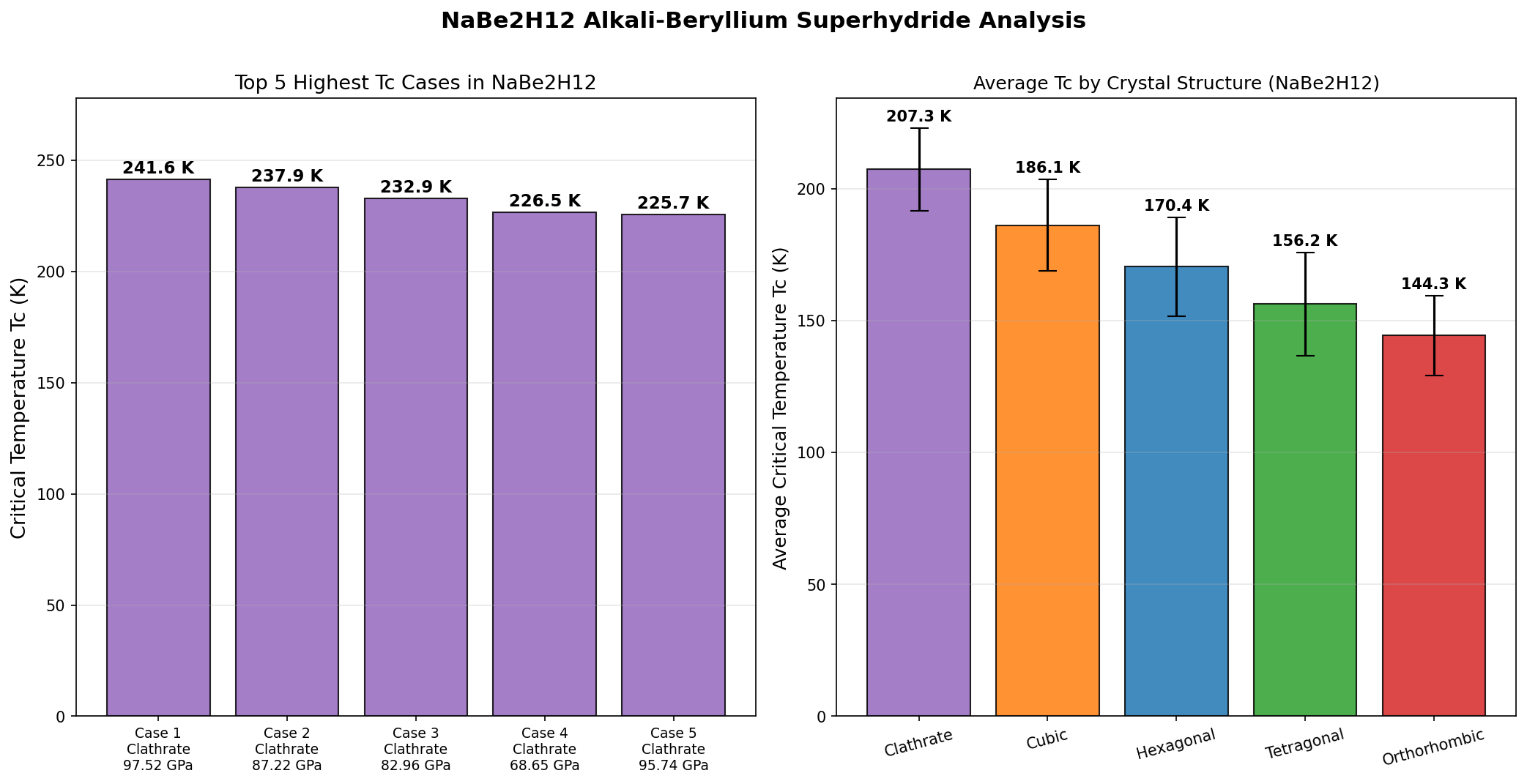 NaBe₂H₁₂ joins a crowded but elite club. Experimentally confirmed high-Tc hydrides include H₃S (around 203 K at 155 GPa) and LaH₁₀ (around 250–260 K at 170 GPa). There are also controversial reports of carbonaceous sulfur hydrides and other mixed systems, some of which have been retracted amid scientific debate.