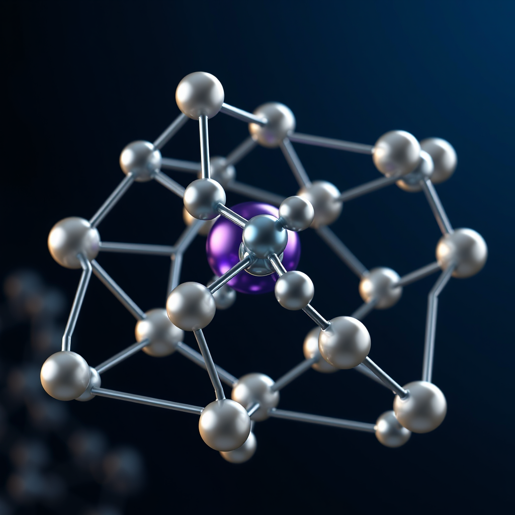 Photorealistic 3D ball-and-stick molecular structure visualization of NaBe₂H₁₂ alkali-beryllium superhydride crystal lattice, professional chemistry textbook illustration style, scientifically accurate atomic representation showing a central large violet sodium atom surrounded by two smaller steel-blue beryllium atoms forming a coordination framework, with twelve small white hydrogen atoms arranged in an expanded polyhedral cage geometry around the metal core, hydrogen atoms forming icosahedral-like clustering patterns, semi-transparent atomic orbital overlaps rendered with soft glowing electron density clouds, high-resolution photorealistic rendering with dramatic directional studio lighting casting subtle shadows on each atom, metallic sheen on beryllium atoms, crystallographic unit cell boundary shown with thin white wireframe lines, deep dark navy blue gradient background, volumetric ambient occlusion shading on all bonds, cylindrical bond sticks in neutral gray connecting all atomic centers, depth-of-field bokeh effect on distant lattice repetitions, ultra-detailed scientific visualization, 8K resolution quality, professional crystallography journal cover artwork aesthetic