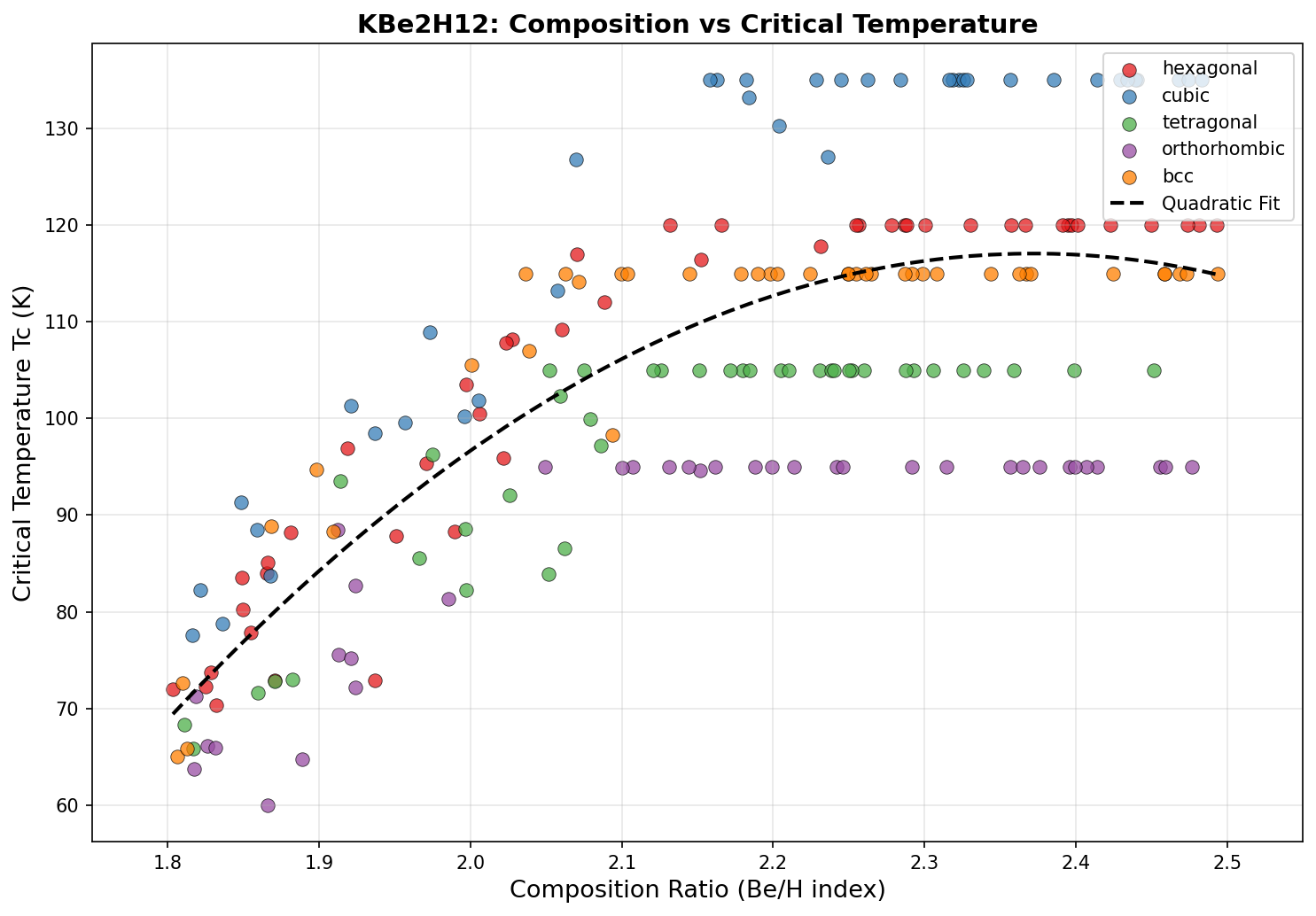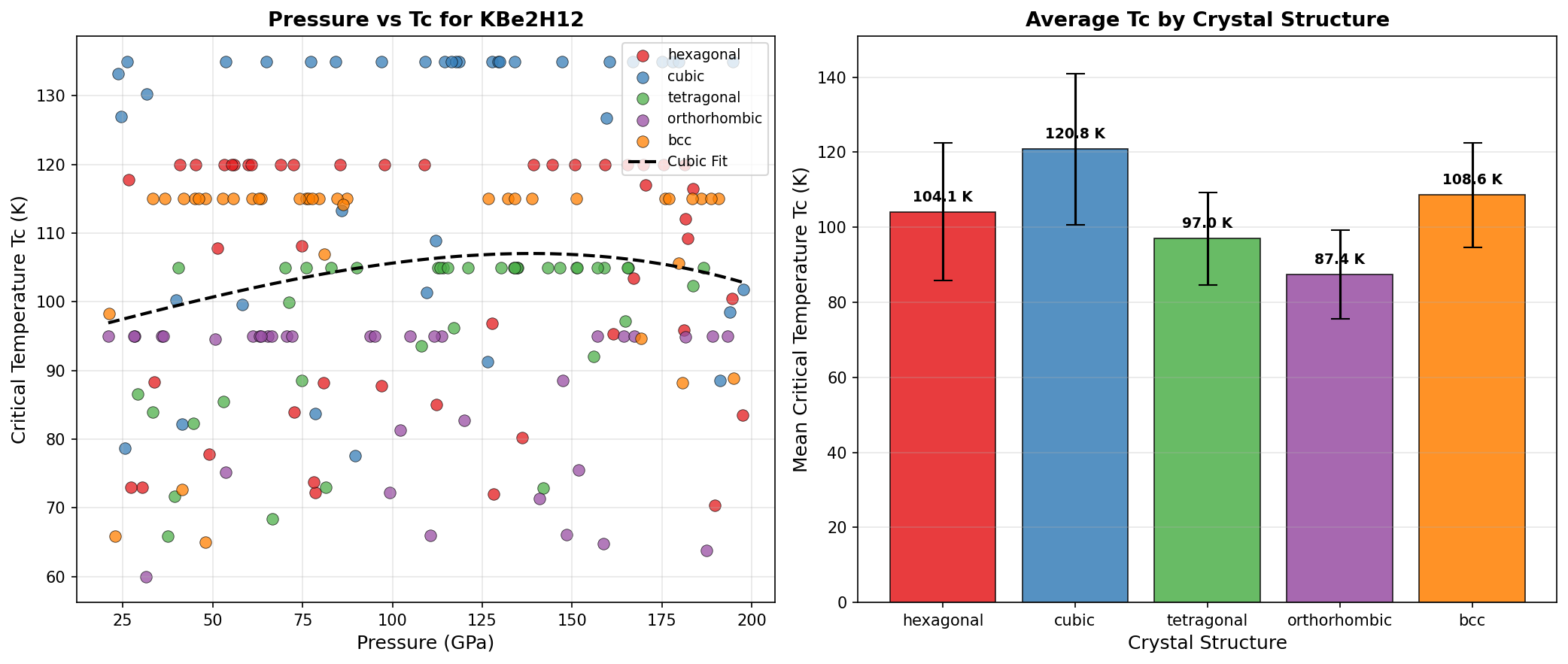 In computational simulations, KBe₂H₁₂ reaches a critical temperature (Tc, the temperature below which superconductivity kicks in) of 135.0 K. That's −138 °C — still cold, but warm enough to be reached with liquid natural gas rather than exotic cryogens like liquid helium. The optimal pressure in these calculations was 127.8 GPa, roughly 1.26 million times atmospheric pressure.