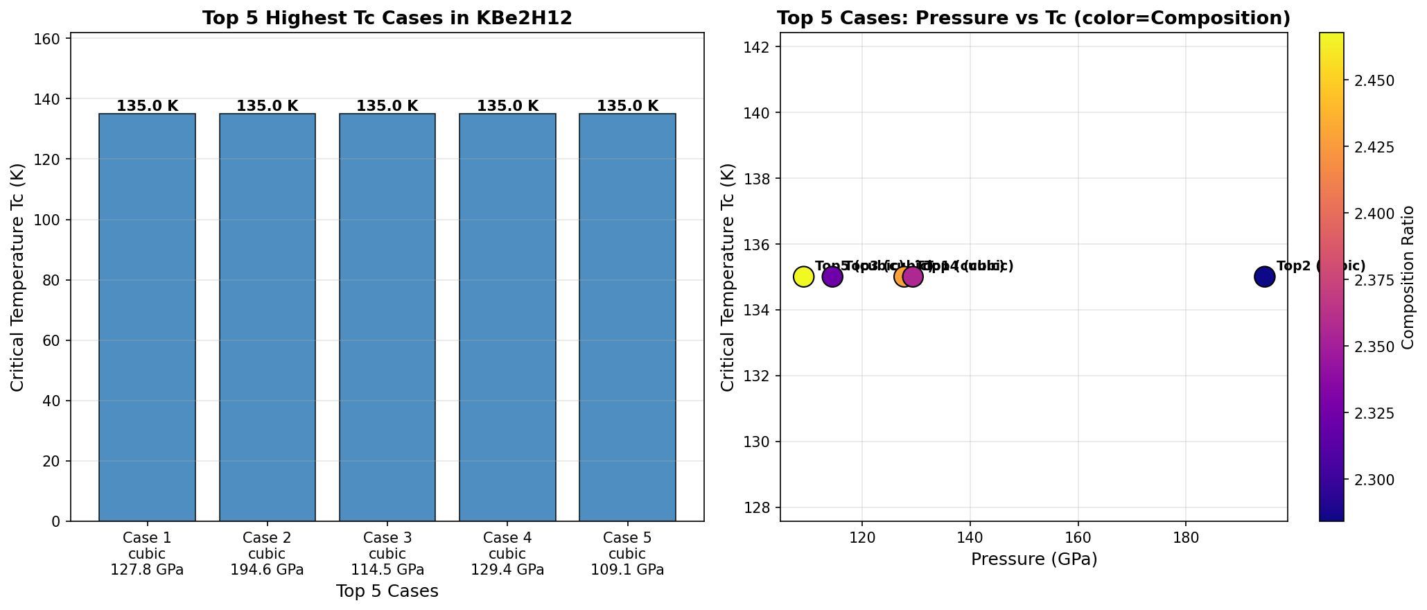 Across 200 simulated cases varying pressure and structural parameters, the dataset tells a surprisingly clean story. The top five configurations all landed at exactly the same Tc — 135.0 K — but across a pressure range that matters: