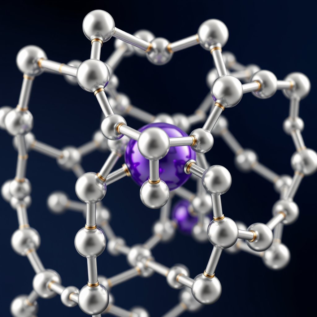 Photorealistic 3D ball-and-stick molecular structure visualization of KBe₂H₁₂ crystal lattice, professional chemistry textbook illustration style, scientific accuracy, showing large violet-purple potassium ions with significantly larger ionic radius at the center of expanded hydrogen cages, small grey beryllium atoms forming tetrahedral coordination nodes, tiny white hydrogen atoms arranged in icosahedral and dodecahedral cage configurations surrounding the beryllium framework, the expanded lattice geometry clearly demonstrating larger interatomic spacing compared to sodium analogs, metallic bonds rendered with semi-transparent cylindrical sticks in silver and gold tones, deep navy blue background with subtle depth-of-field effect, soft studio lighting with specular highlights on each atom sphere, atomic radii proportionally accurate with potassium visibly larger than beryllium and hydrogen, multiple unit cells visible showing periodic crystal symmetry, professional scientific journal quality rendering, high resolution, photorealistic materials with subsurface scattering on atom spheres, subtle ambient occlusion shadows, crystallographic axes labeled with fine white typography, clean minimalist composition with floating molecular framework on dark background