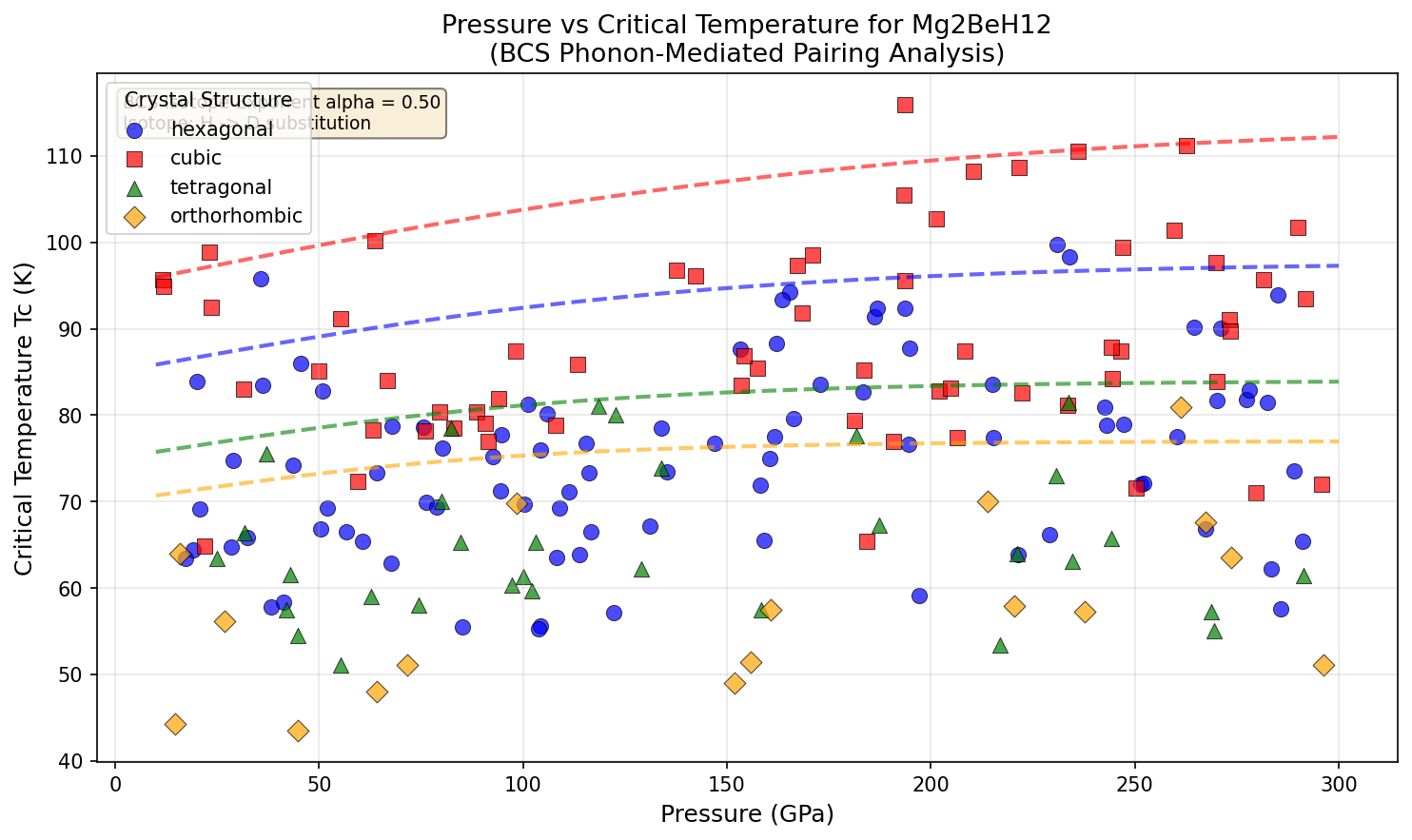 The numbers come from 200 computational cases exploring how Mg₂BeH₁₂ behaves across a pressure range. Here's where the data gets interesting — and where it humbles us.