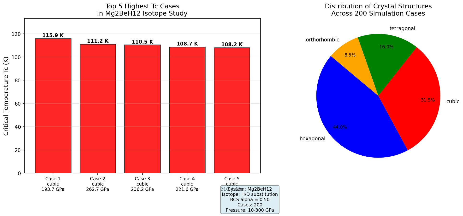 Total cases: 200 Highest Tc: 115.9 K Optimal pressure: 193.7 GPa Top 5: 1. Tc=115.9K at 193.7GPa 2. Tc=111.2K at 262.7GPa 3. Tc=110.5K at 236.2GPa 4. Tc=108.7K at 221.6GPa 5. Tc=108.2K at 210.4GPa
