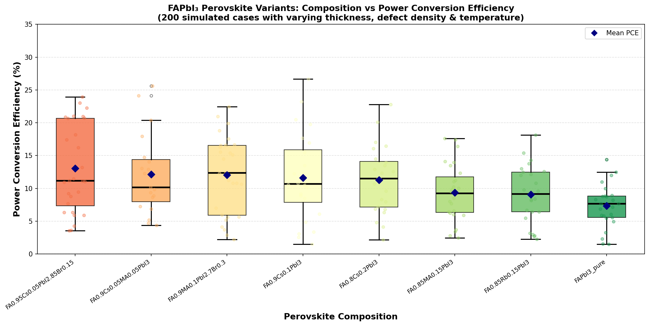Our computational analysis of 200 configurations reinforces what the experimental community has been finding in laboratories worldwide: FAPbI3, with its optimal bandgap near 1.51 eV and simulated efficiencies reaching 26.69%, is one of the most compelling solar materials ever discovered. The gap between simulation and deployment is real β but it is narrowing.