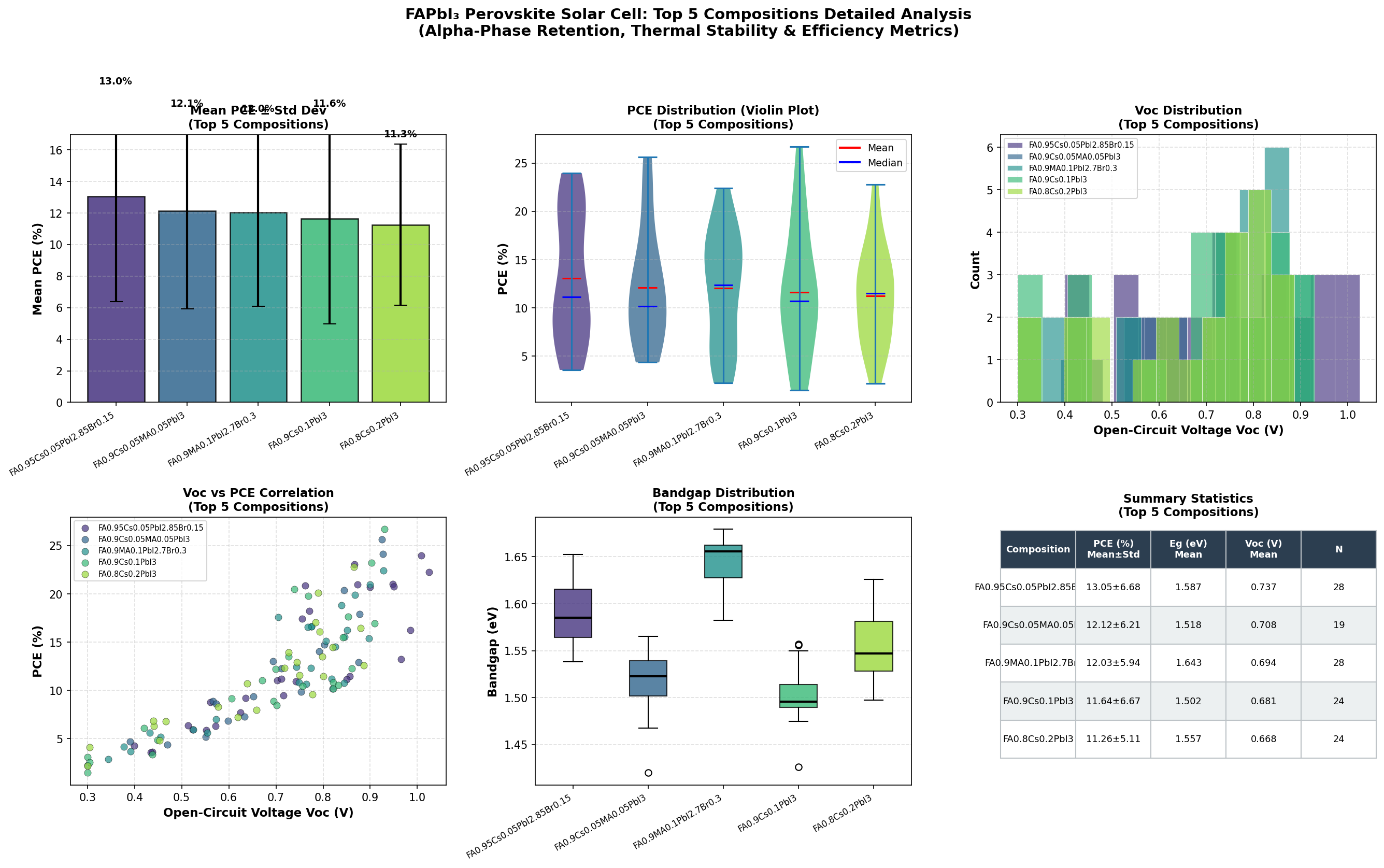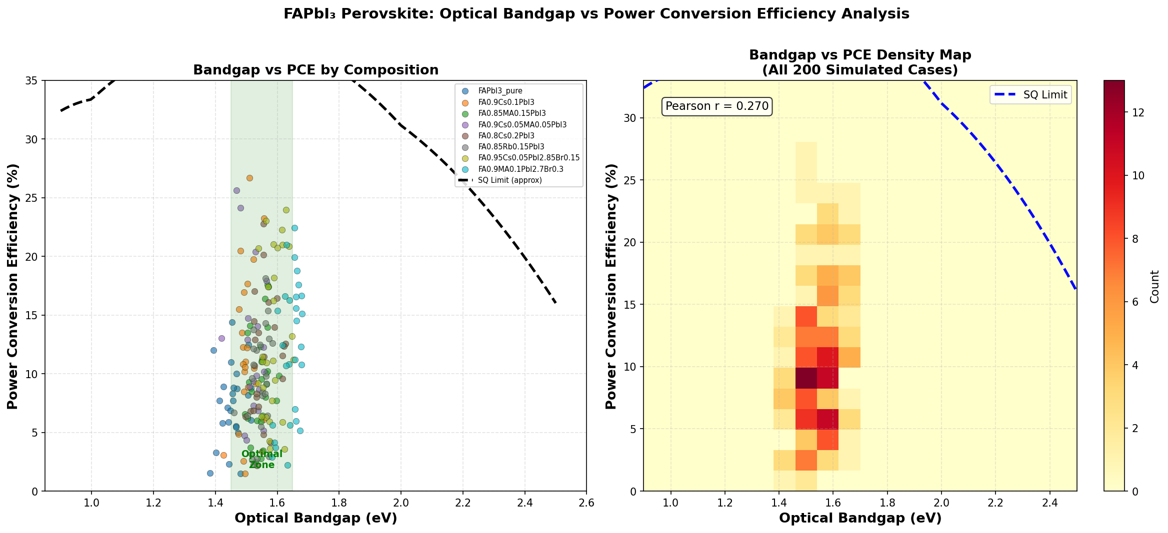 What's particularly striking is the tight clustering of the top results. The difference between the first and fifth best configurations is less than 3.5 percentage points in efficiency and only 0.16 eV in bandgap. This suggests that FAPbI3 is not a finicky, one-trick material. It maintains high performance across a range of conditions, which is exactly what engineers want when they start thinking about real-world manufacturing, where perfect precision is expensive and impractical.